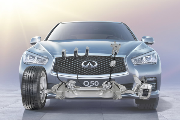 甫於美國、與歐洲市場推出的Q50運動房車,則是Infiniti全新產品攻勢的先發車款;Infiniti Q50展現了品牌強烈、且創新的設計語彙,更包含充滿熱情的精湛工藝、與一系列獨步全球的車用科技,其中最主要的Direct Adaptive Steering轉向系統,則是第一款在市售車上應用的「steer-by-wire」線傳轉向科技。