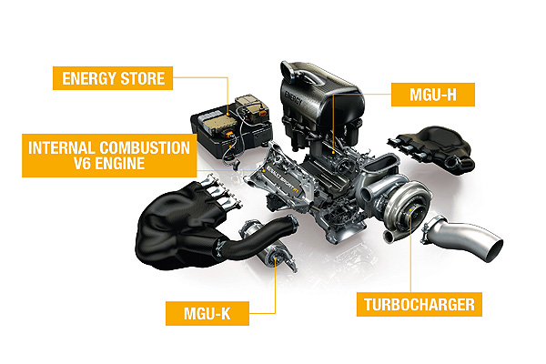 2014年F1賽車的動力來源將不僅是過去慣稱的引擎,而是結合內燃機引擎與ERS能源回收系統、近似於市售車油電混合動力系統的動力單元。