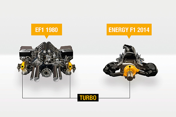 與1980年代的渦輪增壓引擎相比,2014年的F1引擎只允許採用單渦輪增壓設計。