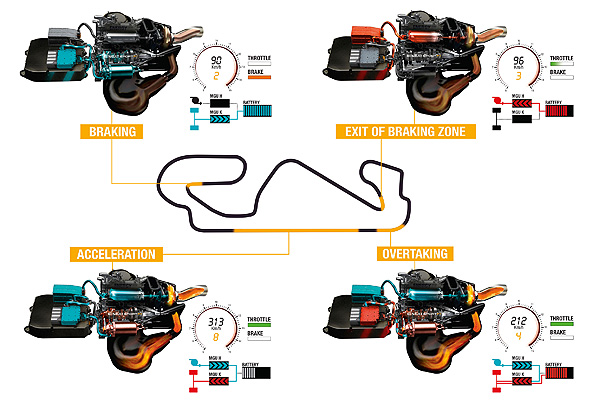 將範圍縮小至一個單圈來看,在大直路時,引擎與渦輪增壓器將會全速運作,渦輪增壓器也會以其最高轉速100000rpm運轉,同時MGU-H會作為發電機之用,將排氣過程中散逸的熱能回收並轉化為電能傳予MGU-K視情況扮演電動馬達的角色,若電池的容量不足,也會轉化為電能進行儲存。另外,當車手踩下煞車踏板時,MGU-K將會搖身一變成為發電機,將多餘的動能轉換為電力儲存在電池之中,也將會是比賽中最主要的充電來源。