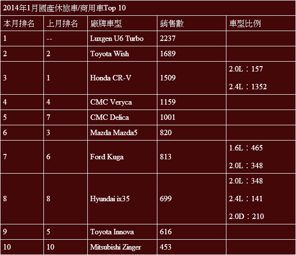 被Luxgen U6 Turbo擠下冠軍寶座後,Toyota Wish與Honda CR-V退而求其次的分居第2名與第3名位置,而除了亞軍與季軍之後,以下的排名名次與上個月也沒有太大變化,最大的變動,莫過於是Mazda5的下滑,從上個月的第3名下跌至第6名,雖然受到車型變動與價格更具競爭力的影響,讓1月份Mazda5的銷售表現較去年同期或與上個月相比皆有進步,但或許是對手進步幅度更為明顯,讓Mazda5不升反跌,實為可惜。