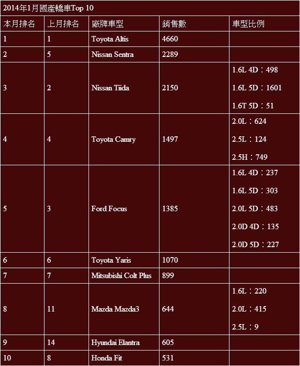 農曆年前的1月份,按照慣例往往也是汽車銷售的高峰期,2014年一開春也沒例外,雖然是場上仍就瀰漫著一股前景不明的詭譎氣氛,但仍舊不減消費者買輛新車好過年的購買習慣,讓國產轎車銷售排行榜中的前十名車款,幾乎有著較上個月更佳的銷售表現,但較去年同期,則表現不同,如Ford Focus、Mitsubishi Colt Plus、Toyota Altis、Toyota Yaris等車型表現進步,但其他車款則較為退步。