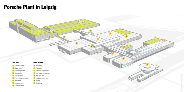 圖示Porsche Leipzig廠區綠色的區域均為擴建後的廠房,包括全新的車體工坊、烤漆房、與完裝區等等在內,均是為了Macan車系所建。