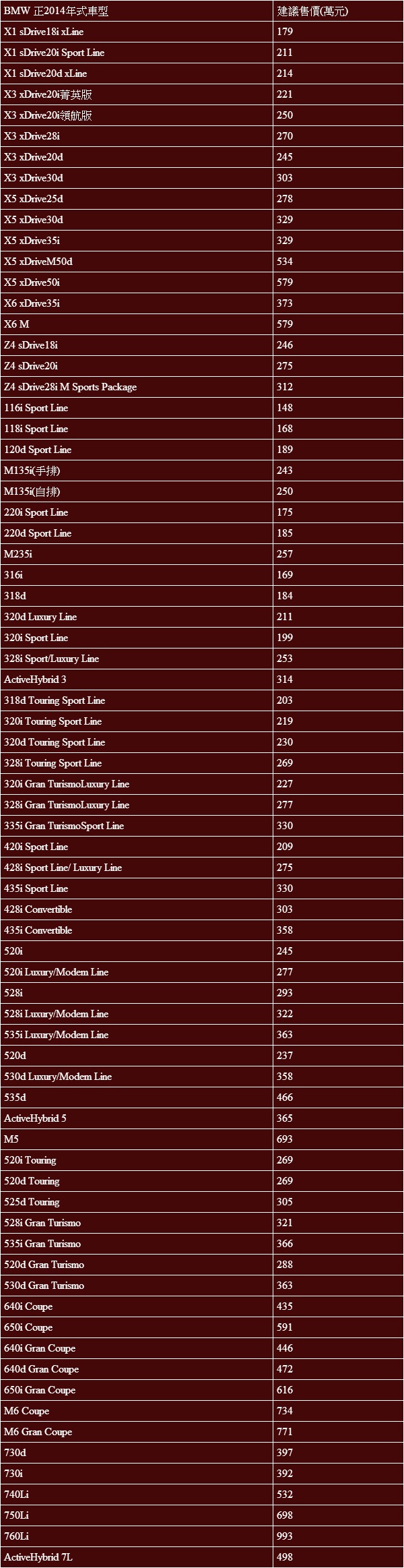 為因應原廠價格調漲,正2014年式BMW全車系價格因此多有變動,其中改動幅度最大者為X1 Series,除停止引進過往引進唯一四驅版本的X1 xDrive25d以外,sDrive20d與sDrive20i車型分別調漲10萬元,僅sDrive18i小漲1萬元。
