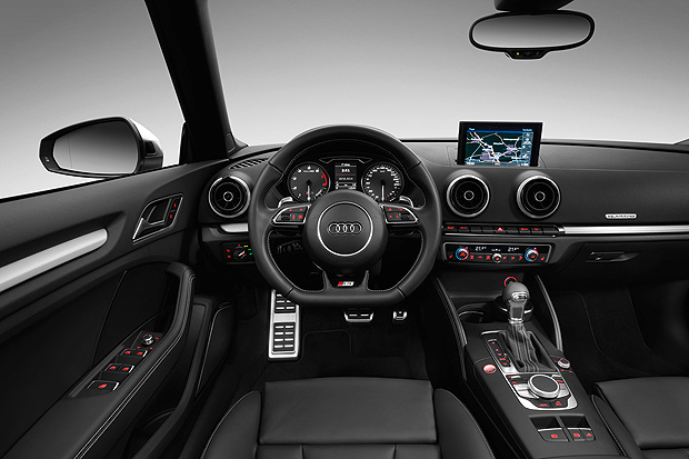 車室內部則延續Audi一貫得出色質感,暗黑的內裝基調中,擁有做工細膩且質感突出的車室鋪陳。採用Nappa真皮,並烙有S3徽飾的運動化座椅,勾勒出運動感強烈的氛圍,再加上平底3輻式真皮多功能方向盤、尺寸加大的換檔撥片、金屬踏板組,以及同樣印有S3徽飾的儀表板表面等,即使變換為敞篷車型,也不忘性能車款該有的設計。另外,也由於S3 Cabriolet的上空設定,Audi同時導入一款特殊的顏料,可以防止深色的內裝在陽光的曝曬下迅速升溫,同步保護內裝用料與車內乘員。