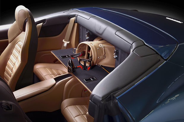 California T座艙設計符合人體工程學原理,採用Frau皮革裝飾,做工精湛。空間也可靈活改變,行李廂和後排座椅之間可連通,即便頂篷收起後,行李廂也能充分利用。