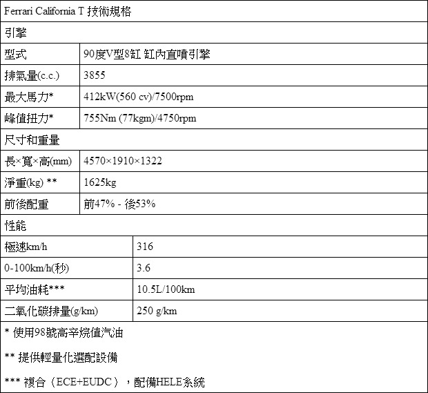 與F1賽車一樣,引擎借由渦輪增壓提升效率。與上一代California相比,新款California T油耗降低15%*,在第七檔時,新車型動力增加70cv,扭力提升49%。二氧化碳排放量削減至250 g/km,相當於20%的二氧化碳功率比(0.44 g/km/cv), 續航里程增加15%。