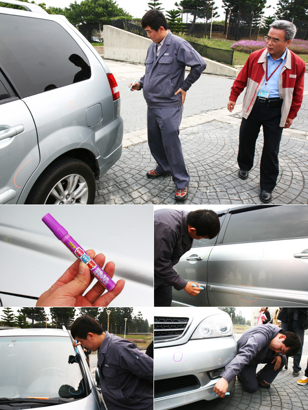 跑檢測流程的一開始,ARTC會先請專員檢視車輛外觀,然後在任何有瑕疵、或損傷的車體表面做記號,然後拍照存證,而這劃記的色筆畫在車體鈑金上是可以擦拭乾淨的,因此車主無需擔心,在與車主進行確認後,接著就能排隊,並準備進行逐車審驗。