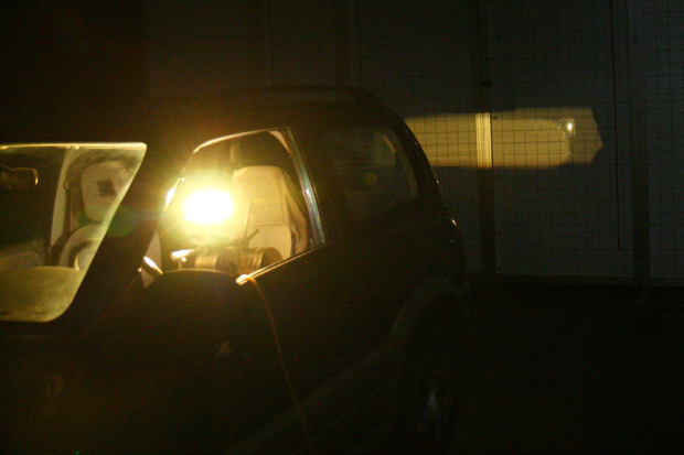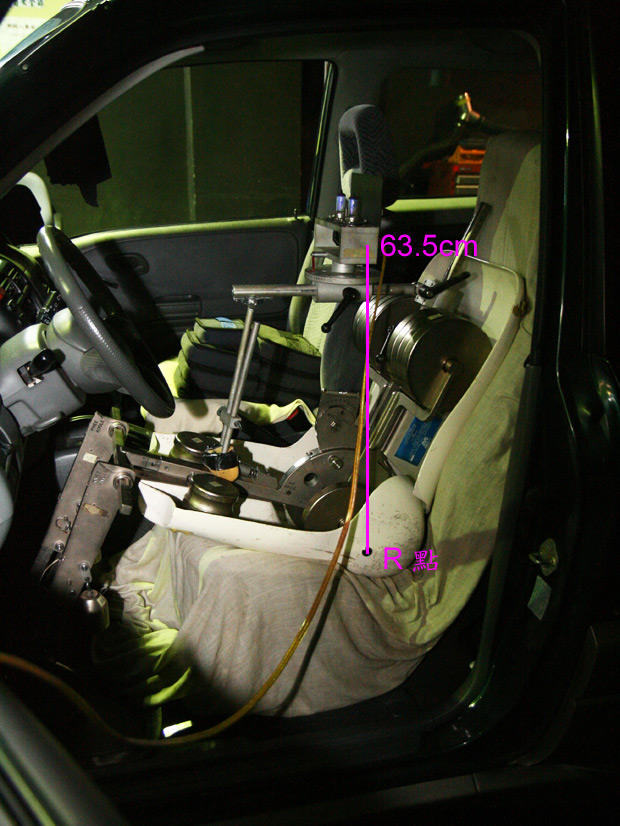 首先,ARTC先進行交通部所規定的安全檢測示範,包括有燈具、以及間接視野裝置(即後視鏡)的測試。這裡ARTC會以一具模擬人體的「H machine」,模擬駕駛人視野(R點、也就是坐點中心垂直向上63.5公分),並以燈光投射來做校正與檢測,而根據鏡面曲面率的不同,視野當然也有所差異。法規規定,駕駛人向正前方看去、以及看著左側後視鏡之間的夾角不得大於55度,右側後視鏡則沒有相關的限制。