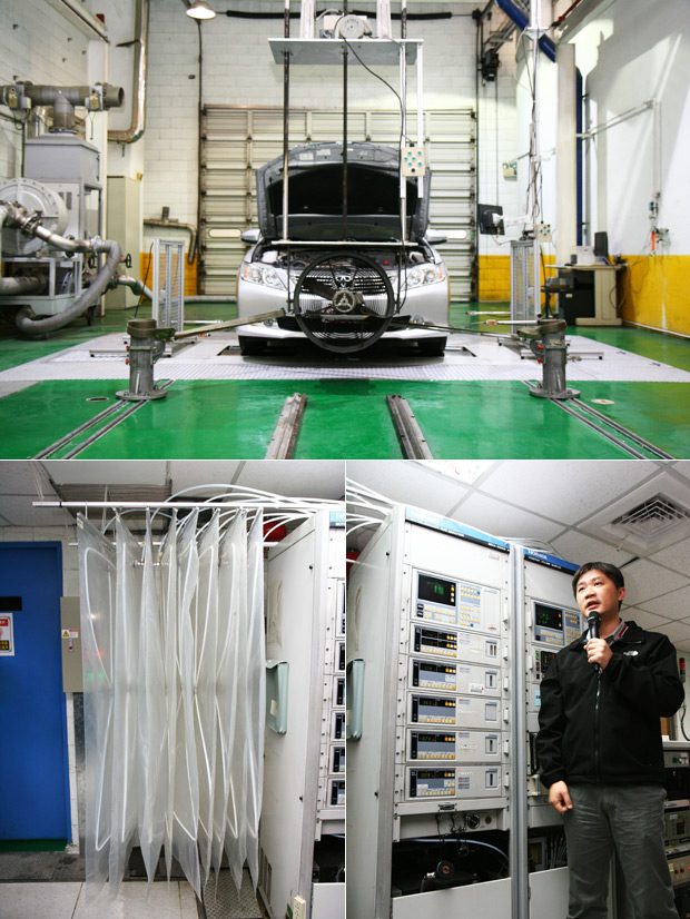 接著,ARTC帶我們來到測試排污與油耗的實驗室,車子這時是架設在固定位置進行測試,實驗室內設有即時監測儀器與集塵袋,可顯示車輛所排放的有害物質等等。