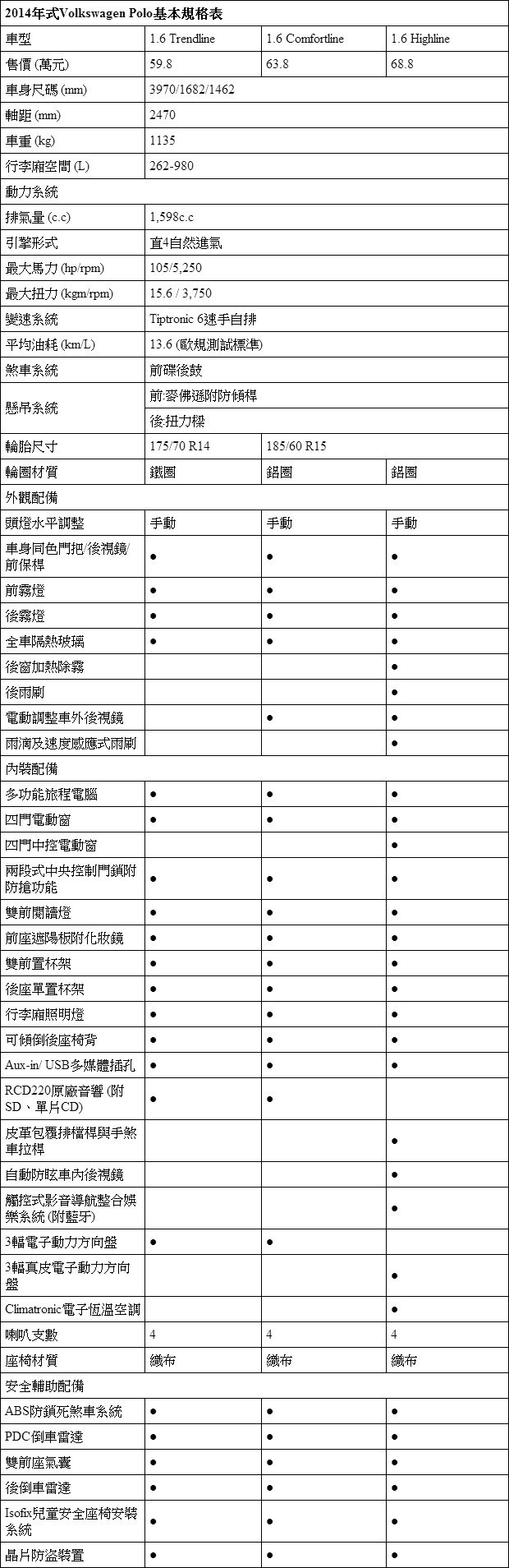 與13年式的Polo相比,14年式Vento與Polo不僅增加車型陣容,皆開出Trendline、Comfortline與Highline的3車型規劃,也就配備水平進行調整,主要著重在外觀與舒適性配備水準的提升。除TL車型搭配與13年式Polo相同、尺寸175/70 R14及鐵圈的圈胎組合外,CL與HL車型皆標配185/60 R15與鋁合金輪圈的組合。同時,全車系也將過去未有的前霧燈列為標準配備,高規車型且植入前氣壩鍍鉻飾條,提供更具質感的外觀造型。