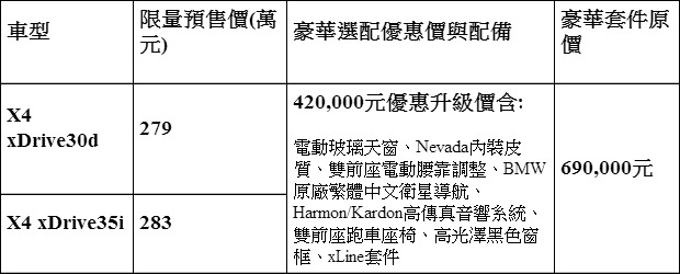 而於2014年4月紐約車展中正式現身的BMW X4,也將再次演繹BMW X家族的成功基因。全新BMW X4擁有優雅跑車線條與BMW X家族的休旅性能,標準5人座的設定則能滿足日常或休閒需求,成為中小型運動休旅級距的耀眼新星。BMW總代理汎德公司將於今年第三季引進全新BMW X4 xDrive30d (預售價279萬)、BMW X4 xDrive35i (預售價283萬),提供國內消費者與世界同步的產品選擇!