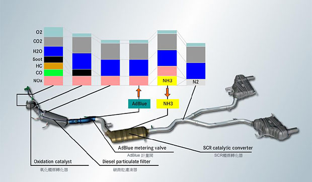 以上述的歐盟排放法規規範,可以清楚了解到,目前柴油引擎排放廢氣中,大致會有幾大項內容物,包含O2、CO2、H2O、Soot、HC、CO與NOx,其中有害物質主要為Soot、HC、CO與NOx等四項,因此在Mercedes-Benz的規劃中,主要以氧化觸媒轉化器、碳微粒濾清器、AdBlue計量閥與SCR觸媒轉化器等位於排氣系統中的四大部件,來一一消滅這四項汙染物質。其中HC與CO主要由氧化觸媒轉化器消滅、Soot由碳微粒濾清器負責,而AdBlue計量閥則透過尿素來將NOx轉換成CO2與NH3,並在SCR觸媒轉化器中,轉化成N2與H2O,也就是氮氣與水,讓上述的四項有害物質,可以降低至符合排放法規的要求。