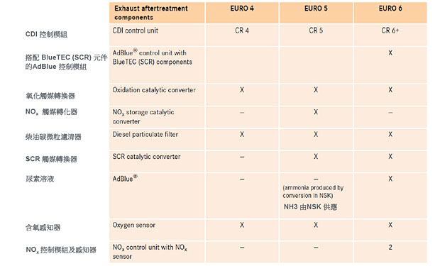 依照排放管制等級的不同所使用的元件(X為配備項目)。