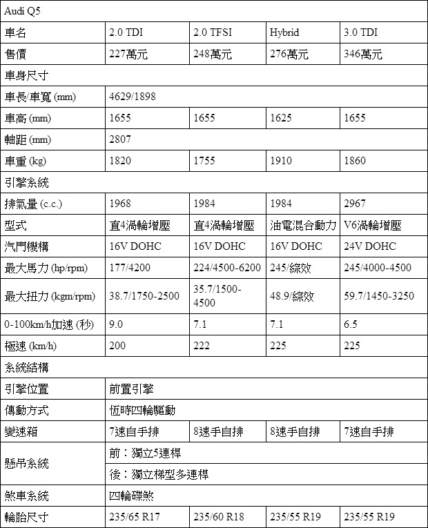 與Porsche同屬Volkswagen集團陣營的Audi,旗下開價227萬至346萬元的Q5算是與Porsche Macan較為接近。不過,在Audi的操作上,Q5並非以跑格或是運動化作為主要的溝通手法,而是透過多樣化的動力選擇,給予從2.0 TDI、2.0 TFSI、3.0 TDI到Hybrid油電混合動力等豐富的動力編成,提供較具節能風格的豪華中型SUV產品。