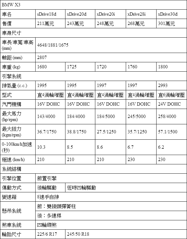 以BMW獨創SAV概念為藍本所創造的X3,以211萬元至301萬元的價格帶作為BMW家族陣容中的中堅SUV產品。以偏向Crossover與跑格概念研發X3,在取向上要與Porsche Macan更為接近。而BMW也為臺灣消費者提供豐富的動力編成,包括sDrive18d、xDrive20d、xDrive20i、xDrive28i與xDrive30d等5種動力選擇。入門的sDrive18d還採取單純的後輪驅動設定,讓追求後驅駕馭樂趣的消費者有更純粹的SUV車款可供選擇。