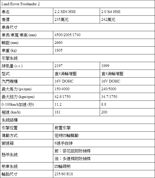 以越野性能聞名的Land Rover品牌,旗下於1997年所推出的Freelander車系要屬豪華中型SUV產品中最為硬派的一款。方正的車身輪廓,搭配Terrain Response地形反應系統,以及2.2 SD4柴油引擎與2.0 Si4汽油引擎等兩款動力,讓Freelander 2擁有豪華中型SUV產品中最為出色的越野能力。235萬元至242萬元的價格帶,搭配強悍的越野能力與英倫風格濃厚的豪華內裝,也能吸引喜愛戶外活動的消費族群。