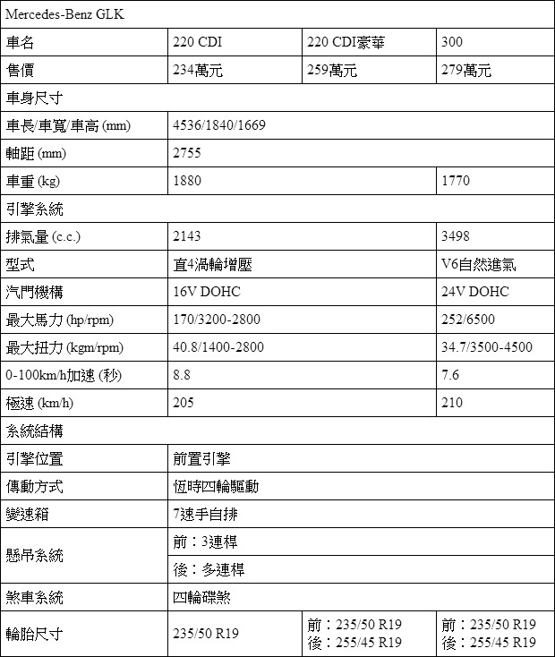 車頭的三芒星廠徽,對於鎖定豪華品牌的消費者而言,一直是最不易犯錯的選擇。在2008年時發表的GLK車系,正好成為入主Mercedes-Benz家族SUV產品的入門選擇,3種車型、220 CDI與300等兩款動力,以及230至279萬元間的價格帶,與同級對手相比顯得相對單純。不過,Mercedes-Benz的三芒星廠徽與品牌形象,還是能對某部分的消費族群起作用。