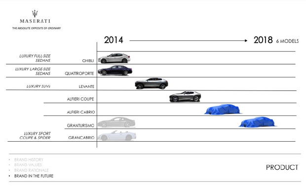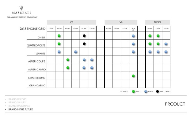 到了2018年,Maserati品牌旗下將有GranTurismo、Quattroporte、Ghibli、Levante、Alfieri Coupe、與Alfieri Cabrio等六款車型選擇。