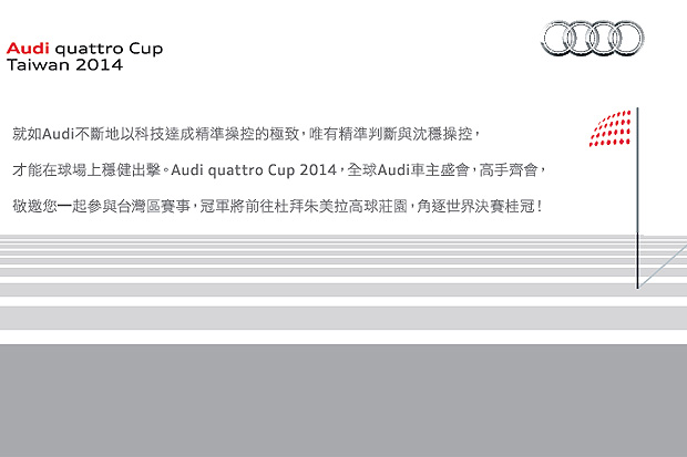 至於今年度的台灣決賽則訂於7月2日在桃園縣龜山鄉的東方高爾夫俱樂部舉行,最後獲勝的冠軍隊伍屆時將取得參加12月7日至12月11日於阿拉伯聯合大公國第一大城—杜拜的朱美拉高球莊園(Dubai, United Arab Emirates Jumeirah Golf Estates)登場的2014年Audi quattro Cup World Final世界決賽資格,代表台灣出征與全球好手同場競技,爭取世界第一的最高榮譽。