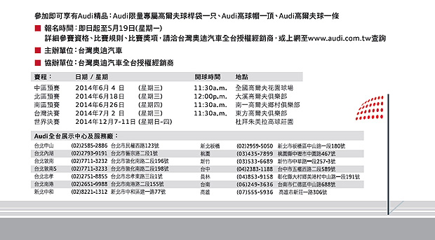 「2014 Audi quattro Cup車主盃高爾夫球賽」即日起至5月19日止正式開放報名,預計將分別於台中、台北、台南等三區舉辦預賽,首先登場的中區預賽將於6月4日在苗栗全國高爾夫花園球場率先開打,屆時預計將有120位高手同場較量球技;接著每年同樣盛況空前的北區和南區預賽,則將先後於6月18日和6月26日依序舉辦,比賽地點則分別為桃園大溪高爾夫俱樂部,以及台南市關廟區南一高爾夫鄉村俱樂部,除了北區預賽部份將提供140個參賽名額給北台灣車主之外,中、南區預賽也將提供120個參賽名額給南台灣熱愛高球運動的Audi車主們一起共襄盛舉,享受同場揮桿較勁的樂趣。