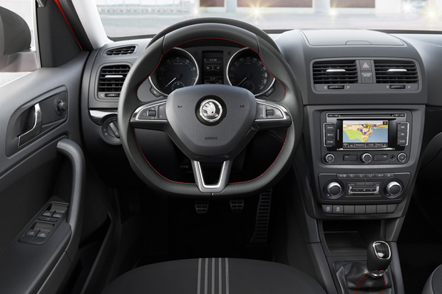 Yeti Monte Carlo特仕車同樣以黑色內裝為主,並輔以真皮包覆的平底式方向盤與排檔桿 / 手煞車拉柄等,其上並有紅色縫線加以點綴。