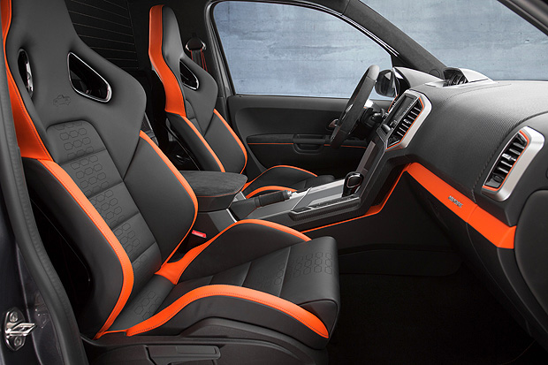 呼應車外的設計風格,採單廂佈局的Amarok Power在車內同樣沿用深灰與橘色的顏色搭配,以Nappa真皮與Alcantara麂皮混搭的方向盤,加上兩張橘色滾邊的筒形賽車座椅,創造出運動風格濃烈的車室氛圍。同時,Amarok Power在車門內室、儀表板總成、一直到中控台至排檔座鞍部等處,都用上了碳纖維貼皮包覆,這樣的Amarok早已不是縱橫山林的狂野分子,而是充滿個性的搖滾樂手。