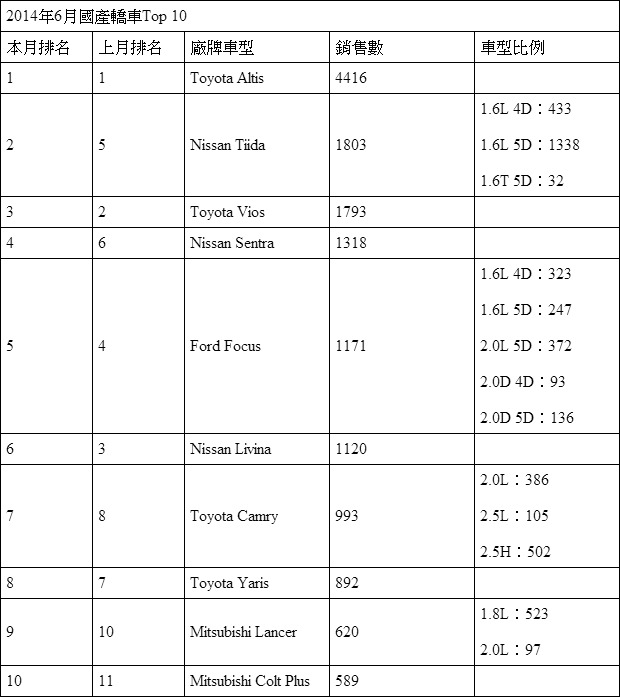 至於國產轎車排行榜中最後兩個席次,則由Mitsubishi兩位長青戰將守住,其中第9名的乃是於5月底方才推出小改款車型的Lancer車款,6月份以620輛的成績展現改款功效,而或許受到Lancer改款吸市能力影響,一向於C/P值面表現不俗的Colt Plus也從上個月的榜外再次入榜,搶攻最後一個席次,以589輛的成績取得第10名位置。
