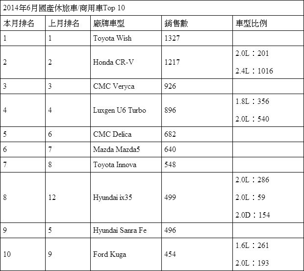 國產休旅市場/商用車款銷售排行榜方面,前4名與上個月完全相同,沒有變動,依序為Toyota Wish、Honda CR-V、CMC Veryca與Luxgen U6 Turbo等四款車型依序排下,而原本的第5名Santa Fe則大幅滑落至第9名,其中原因可能是Hyundai目前以歡慶世足月的促銷方案,針對ix35加以促銷,因此讓ix35從上個月的榜外重新以第8名姿態回至榜內,但也因消費者注意力的轉移,讓Santa Fe名次滑落。