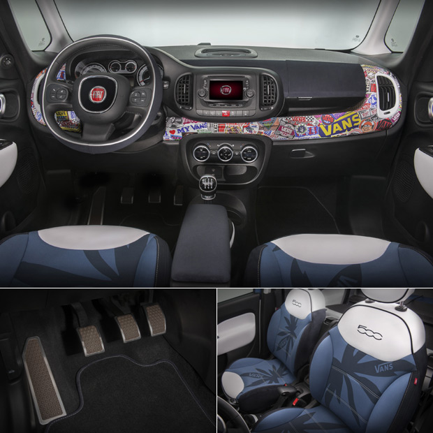 7月26日起於美國加州Huntington海灘所舉辦的Vans US Open of Surfing衝浪公開賽上,Fiat品牌發表以旗下500L為基礎的500L-Vans Design Concept聯名概念車型,這部概念車終實地呈現了Vans品牌原創的高筒鞋設計細節,這其中包括座椅椅墊上復古的棕櫚葉圖樣,另外設計有Vans logo的車貼,則呈現在車室內的中控面板上,至於Vans鬆餅格紋狀的鞋底設計,則應用在這輛500L的踏板組、與儲物空間內。