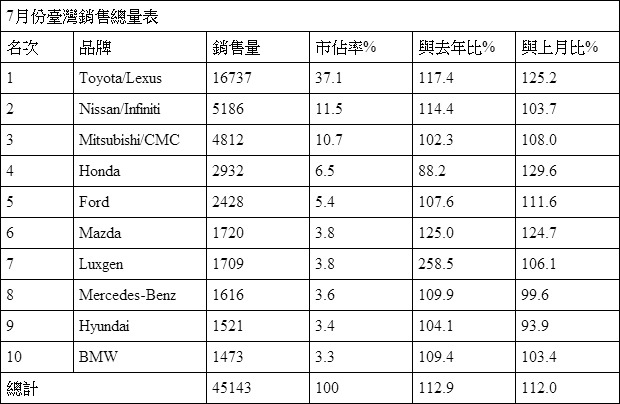 在民俗月前的最後一個銷售大月 ─ 7月,臺灣汽車市場修售數據再度井噴,最終以45143輛的成績作結,較已經相當可怕的6月份再進步足足12%,多出幾乎快五千輛!而若以品牌觀之,Toyota/Lexus不僅理所當然仍是贏家,而且在本月份進一步將領先幅度誇張的擴大,7月Toyota/Lexus的市占率衝上37.1%,較上月的33.1%大幅度成長,也因此讓1-7月銷售總量昂首闊步0.9個百分點(目前市占33%),累積銷量84300輛。