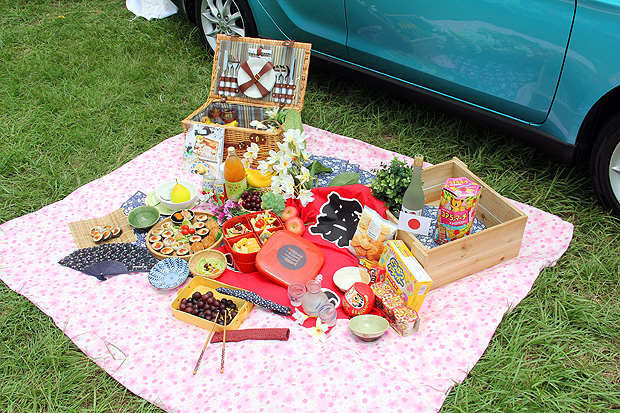 以日本為主題的野餐擺飾可以看見日式便當、壽司與日式零嘴等食品,搭配櫻花圖樣的野餐墊等。