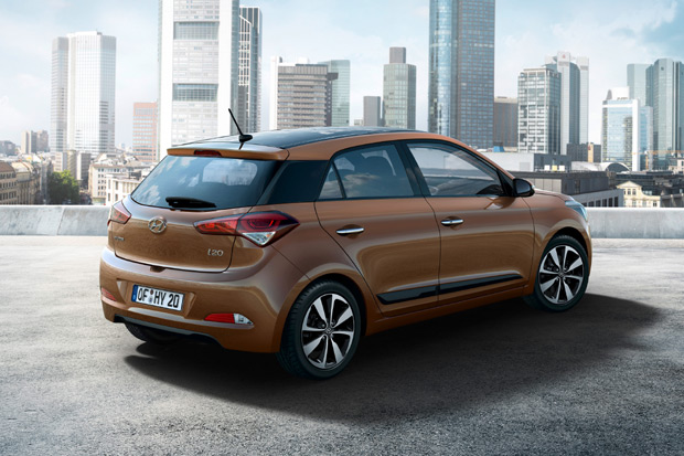 從車頭看去,Hyundai i20將鍍鉻邊條環繞的六角形前保桿氣壩,設置在連結頭燈組的水平細條狀水箱護罩之下,而頭燈組更整合LED的晝行燈與定位燈,而氣壩下方的橫向氣柵亦整合了霧燈的設計;從車側看去,藉由C柱高亮度黑色烤漆的設計,讓i20的車頂線條彷彿有著飄浮的感受,而車尾則以迴力鏢狀的LED尾燈為視覺重心。