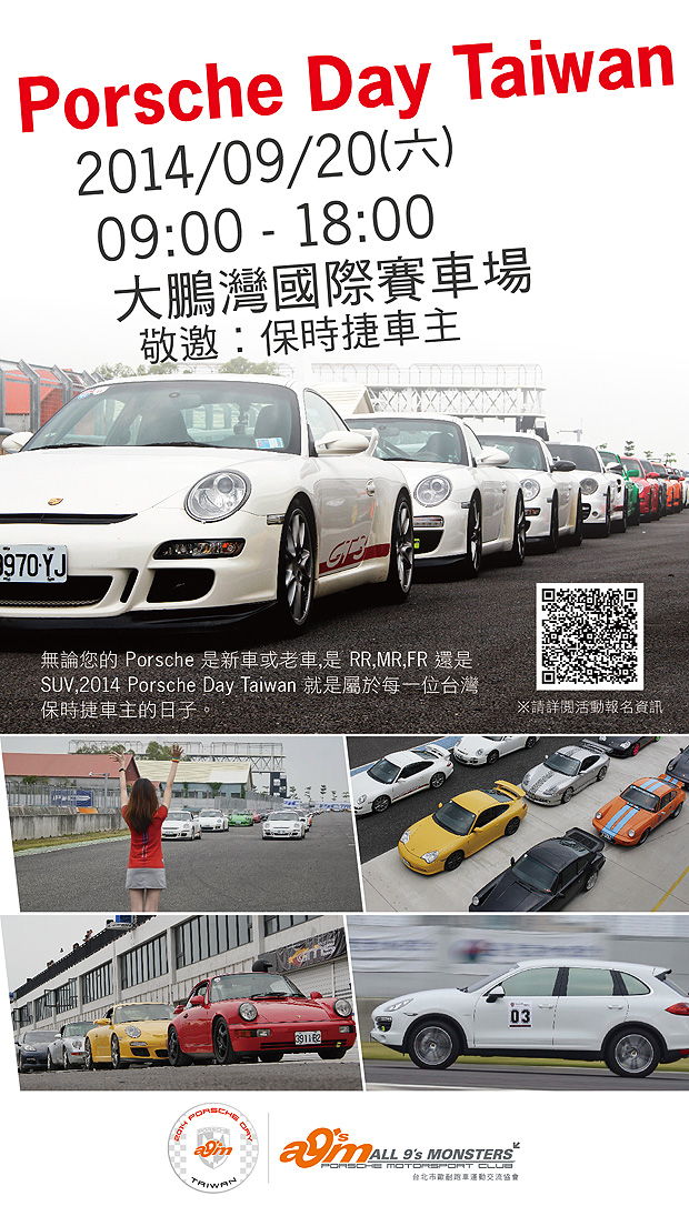 在臺灣,狹窄的街道、無處不在的測速照相,總是讓坐擁性能跑車的車主感到無處發揮。為了紓解車主心中的癮頭,a9m車隊選定9月20日於國內唯一一座FIA Grade2等級賽道──大鵬灣國際賽車場舉行Porsche Day Taiwan活動,邀請全臺各地的Porsche車主前往賽道,一同感受賽道的魅力,並藉此了解愛車的特性與增進駕馭技巧。