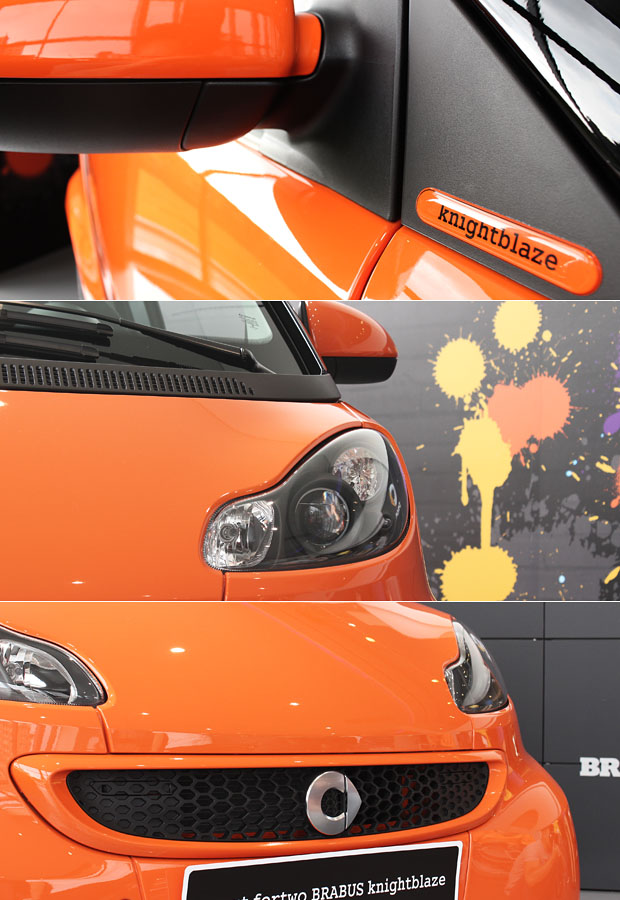繼先前smart fortwo BRABUS limited ed. knightgreen作品,此次smart與BRABUS再度合作,全新推出的smart fortwo BRABUS limited ed. knightblaze,從車名就可感受到炙熱火焰的高溫辣度。BRABUS緊抓住smart與生俱來獨一無二的tridion安全車體作為畫布,以騎士最該具備的闇黑,作為渾身肌肉起伏的最佳印襯。覆蓋上的亮橘色車身鈑件,就連水箱護罩、車側後視鏡罩也不放過,輔以BBRABUS精心打造的同色保桿下擾流飾板與側裙,更是騎士冑甲的最佳武裝。