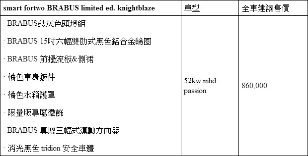 BRABUS再度合作的「火焰騎士」smart fortwo BRABUS limited ed. 限量30台,售價新台幣86萬元。