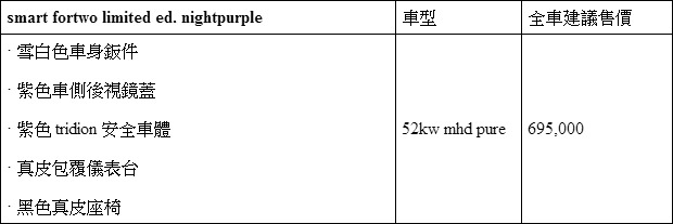 smart fortwo limited ed. nightpurple以時尚潮流為設計主題,售價為新台幣69.5萬元。