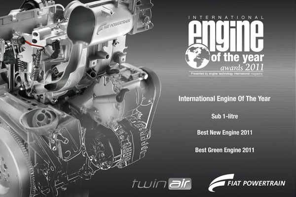 除了年度風雲引擎外,Fiat 875c.c. TwinAir引擎也同時獲得了年度最佳新引擎、年度最佳綠能引擎大賞與1.0升以下級距最佳引擎等大獎。首先於年度最佳新引擎中,Fiat 875c.c. TwinAir承襲去年1.4L MultiAir Turbo得獎科技,且透過引擎規格的縮小,還須同時提高輸出效能、降低油耗與排放汙染等,也因此讓諸多評審給予了此獎項肯定。最佳綠能引擎大賞中,Fiat 875c.c. TwinAir引擎則以其85kg的引擎重量中,僅排放出95g/km二氧化碳排放、23.0km/L的平均油耗,實至名歸的獲得此大獎。從1999年舉辦此獎項以來,1.0升以下引擎級距,皆由日本大廠包辦此獎項級距,其中Honda獲得七次、Toyota也有五次肯定,而2011年首次由歐洲車廠獲得此獎項,Fiat 875c.c. TwinAir引擎的實力可見一斑。