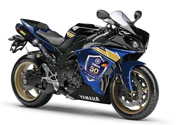 英國Yamaha特別打造的YZF-R1車型,同樣以50週年主題打造,全新設計的藍黑底漆中,繪上了金色經典條紋,並以斗大的WGP 50週年紀念徽飾最為主題,最後換上Akrapovic蠍子管提升性能表現。