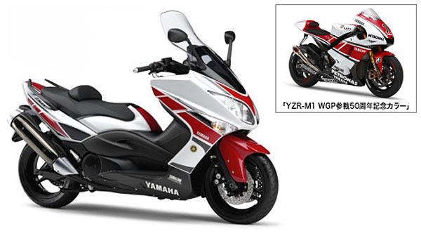市售車型部分,Yamaha也針對其下受歡迎的車款打造50周年紀念車款,首先於運動大羊級距代表車款的T-Max 500車型部分,最新推出XP500 TMAX WGP50th Anniversary Edition車型,車身彩繪換上了與M1 50週年紀念車型相同的Yamaha賽車經典白底紅條紋配色,搭配上WGP 50週年紀念徽飾、車身兩側與M1相同的貼趾、特殊質感處理的煞車卡鉗等,相信以T-Max的受歡迎程度,加上此輛特仕車款的紀念意義,一問世絕對炙手可熱!