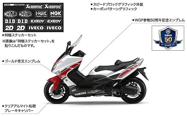 XP500 TMAX WGP50th Anniversary Edition車型車身彩繪換上與M1 50週年紀念車型相同的Yamaha賽車經典白底紅條紋配色,搭配上WGP 50週年紀念徽飾、車身兩側與M1相同的貼趾、特殊質感處理的煞車卡鉗等。