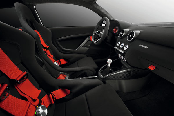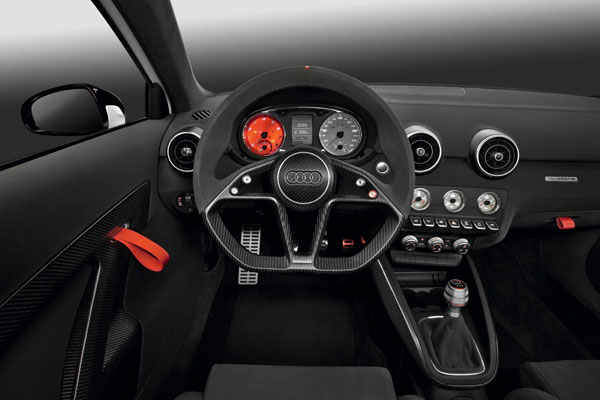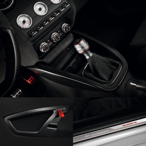純粹為速度而生的A1 clubsport quattro,為了呼應道路版賽車的身分,完全將後座給取消,取而代之的是兩頂專屬的安全帽儲放固定座,座艙中大量採用了消光碳纖維材質〈包括車門板等〉,原來音響系統的位置則改為賽車專用的三環錶〈分別為油壓錶、油溫錶與電壓錶〉座椅部分換裝了兩張源自R8 GT的碳纖複合材質桶椅,搭配上火紅地四點式安全帶,三輻的賽車方向盤則採用CFRP碳纖複合材質搭配麂皮包覆,為求輕量化,車內車門把手與手套箱把手都改成了紅色織布拉環,至於在車內旋鈕、冷氣出風口、腳踏板與排檔頭等部品部分則都用上了鋁合金材質,營造出十足的競技風格。