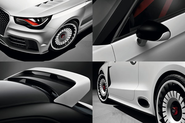 這款有Audi原廠暴改的特別展示車,有著充滿DTM賽車的外觀氛圍,全車採用了寬車體空力套件,前氣壩與左右兩側進氣口皆放大到極致,引擎蓋兩側也多了兩道散熱孔,自前葉子板開始經車門至後葉子板整體寬度共增加了60mm,前葉子板後側方也加入了散熱孔,採冰川消光白的車體塗裝配上由碳纖維複合材質打造的車頂,勾勒出類似R8的雙色搭配,更誇張的是排氣管也改為側排設計,大口徑的橢圓型排氣尾管就置於左側後輪前方,車尾部分,下方全數改為可快速將底盤氣流導出的分流器,車頂上則增添了大型雙層尾翼,以獲得更加的空氣動力效應,尾燈部分也改為燻黑樣式,以凸顯與其他A1的不同,輪圈部分則是換上19英吋的類渦輪風扇之多輻式鋁圈,並搭配尺碼為255/30R19之高性能輪胎。