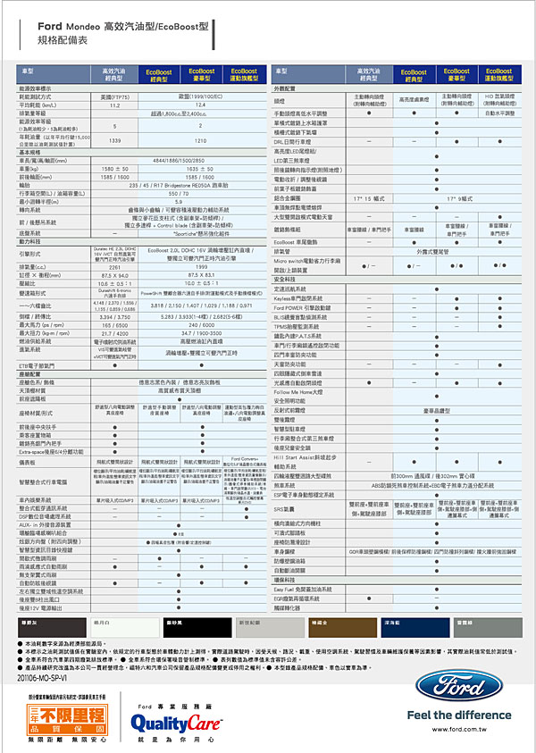 Ford Mondeo 2.3L高效汽油型與EcoBoost型規格配備表。