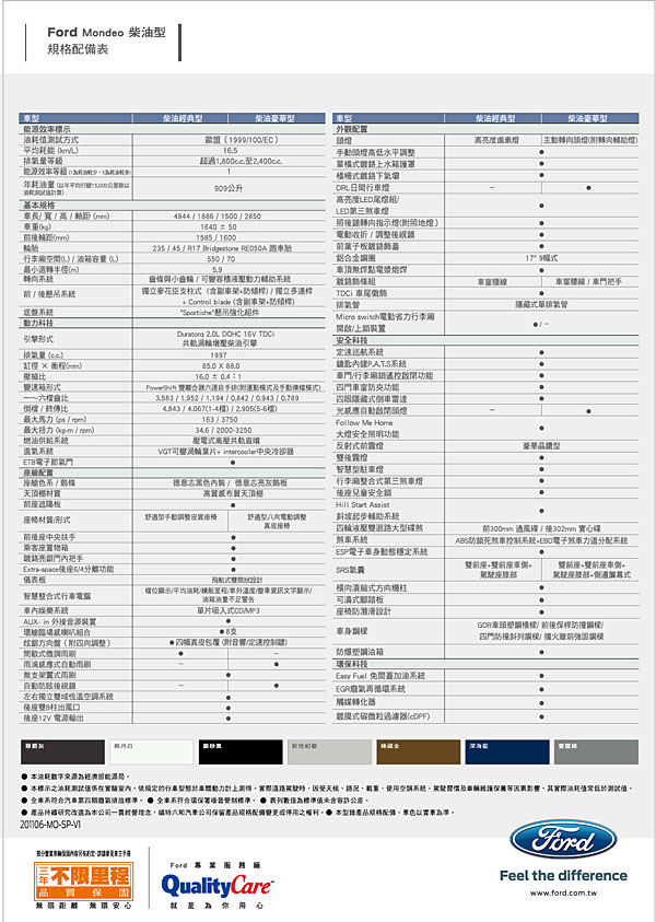 Ford Mondeo 2.0TDCi柴油型規格配備表。