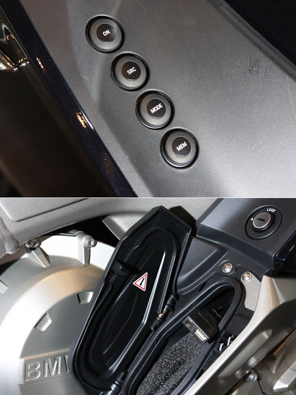 整流罩兩側靠近騎士膝部處,左側為音響控制按鍵組成,右側為Aux-in插座。