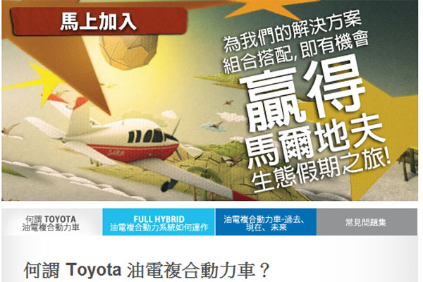 即日起至7月4日止,Toyota在Facebook舉辦為期4週的HSD募集環保創意構想活動,網友只要加入粉絲團,分享最佳的環境解決方案,文字、影片、照片…等等格式不限,每週將會選出1名最佳、最具創意構想者,並贈送iPad 16GB 1台,獲選最佳解決方案的每週冠軍則有機會攜伴參加馬爾地夫Angsana Ihuru Resort生態之旅!此外,在7月6日至7月20日活動期間,上網投票選出最佳創意環保構想的網友,還可抽iPod Nano 8GB。