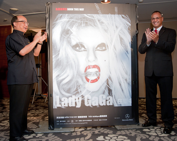 促成LADY GAGA首度訪華宣傳的兩大單位代表人台中市長胡志強(左)與台灣賓士總裁康柏瀚,一同為LADY GAGA訪華活動看板揭幕。