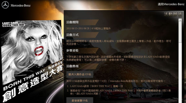 【Mercedes-Benz『BORN THIS WAY為道路而生』創意造型大賽】規則,是以女神卡卡獨具巧思的前衛造型、以及Mercedes-Benz的開創思維作為創作發想,並可融合極具代表性的賓士特色車款之造型概念:如象徵不受拘束與經典風格的SLS AMG鷗翼車門、或是演繹科技未來感的SLR鯊魚鰓狀散熱孔等。參賽者將以創意打造出獨一無二之造型作品,於6月28日報名截止前上傳痞客邦【Mercedes-Benz『BORN THIS WAY為道路而生』創意造型大賽】活動網頁:http://bornthisway.events.pixnet.net,以進行票選活動。