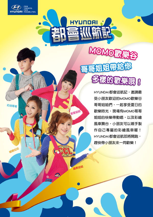 在全台五場的聯合外展中現代汽車除了展示最新車款,更請到小朋友最喜歡的MOMO歡樂谷的哥哥姐姐們,在這個暑假要跟可愛的小朋友面對面親身接觸,消費者也可以不用到展示間就可以親身接觸Hyundai全系列產品所帶來的驚豔。並且除了賞車之外,現場還可以安排Hyundai全車系親身試駕的機會。